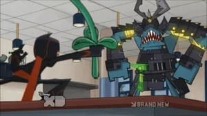 When stanked by the Sorcerer, Brent turns into a turquoise goblin-like monster. Because of his blacksmith skills, stanked Brent is able to build samurai armor for himself. He also has fiery breath, pulling a sword out of his mouth and spewing flames at the Ninja.
