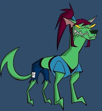 As a stanked demon dog, Morgan retains her hair, clothes, and band-aid. However, she becomes a dark green dog, with sharp teeth, brown nose, and glaring yellow eyes. Her sweat pants is also ripped.