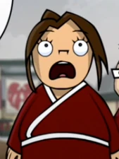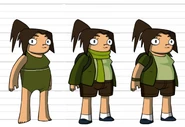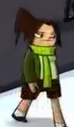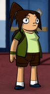 She is a teenage girl with dark brown hair tied into a ponytail, and greyish blue eyes. She wears a dark green shirt and armband, light green T-shirt, dark brown shorts, white socks, and blue shoes.